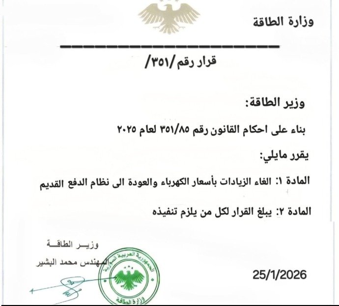 تداولت حسابات على مواقع التواصل الاجتماعي، خلال الفترة الماضية صورة قيل إنها لبيان صادر عن وزارة الطاقة السورية، يتضمن إلغاء الزيادات الأخيرة على أسعار الكهرباء والعودة إلى نظام الدفع السابق.